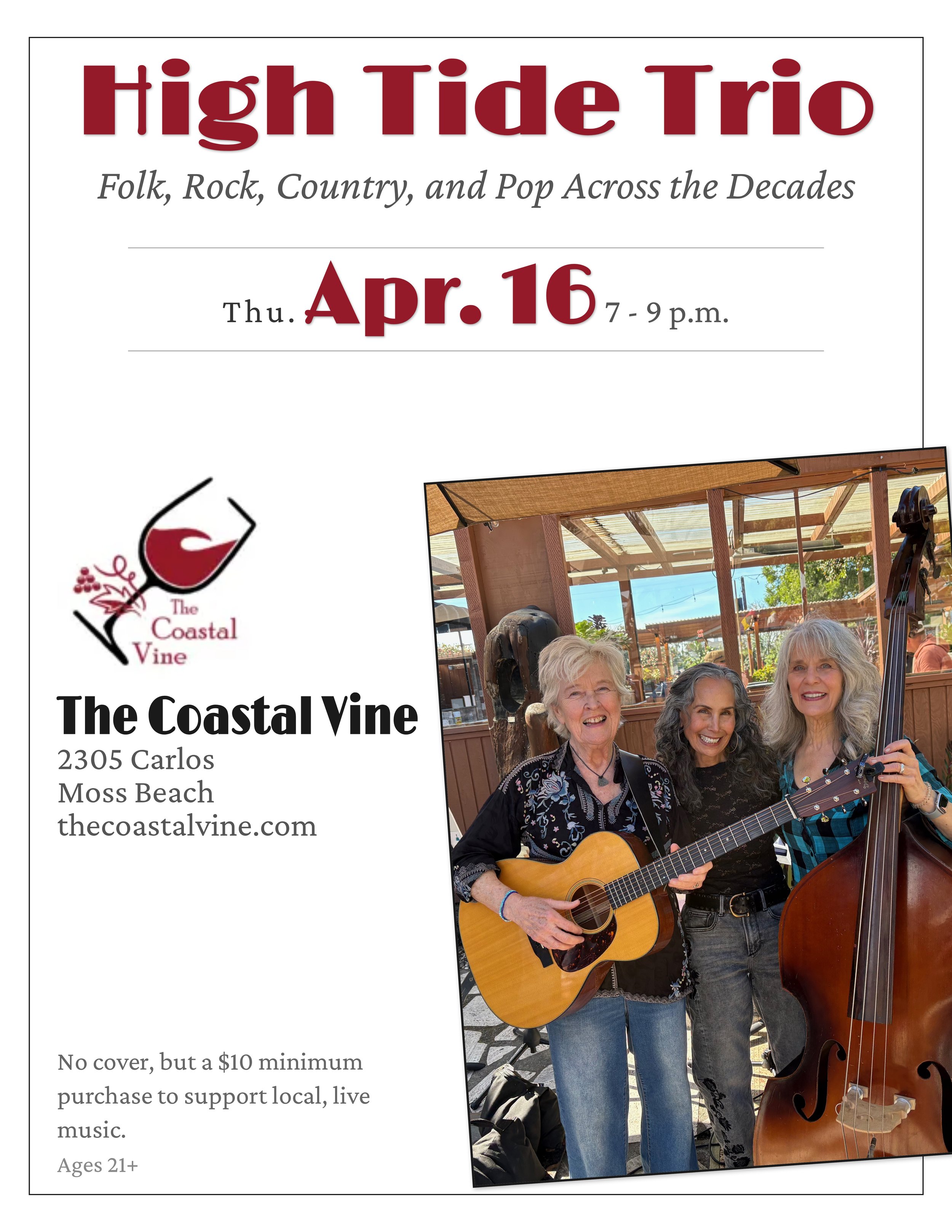 Back to All Events High Tide Trio: Folk, Rock, Country, and Pop Across the Decades Thursday, April 16, 2026 7:00 PM 9:00 PM Google Calendar ICS